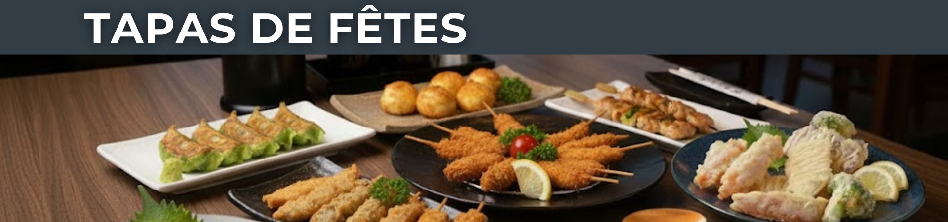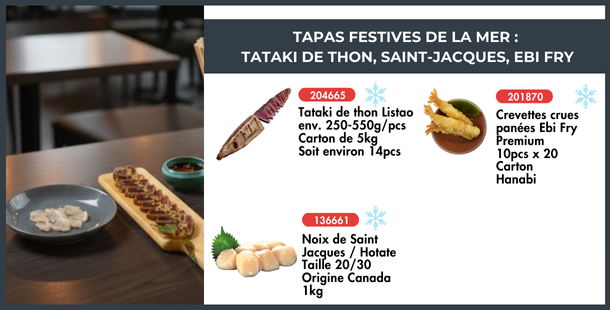 Tapas festive de la mer : Tataki de thon, Saint-Jacques, Ebi Fry